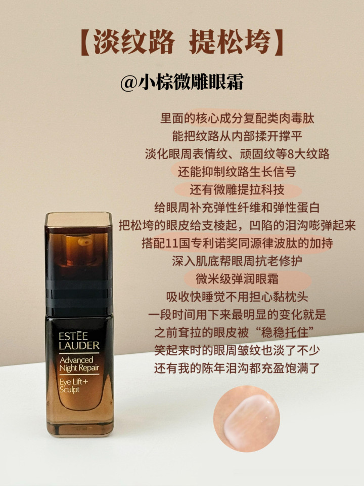 另外还有小棕瓶同源成分律波肽,直达肌底同步修护抗老。微米级弹润质地一推水润,上眼秒渗透不黏腻,用到现在眼周又弹又紧的,眼睛显大又有神,把我从垮眼深渊都给拉回来了。