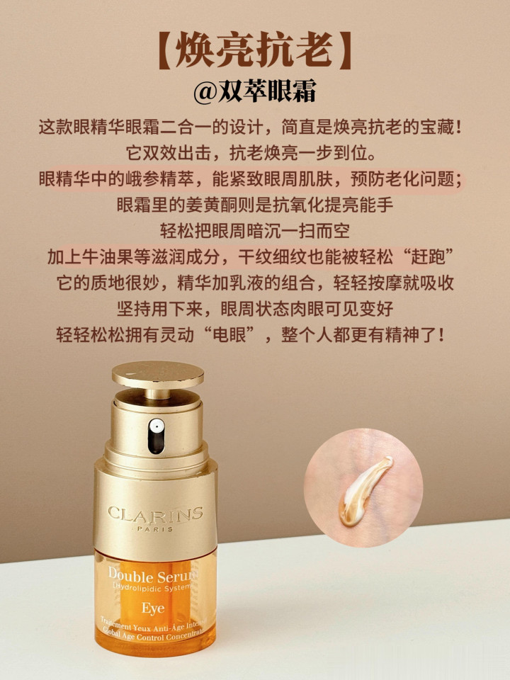 这款眼精华眼霜二合一的设计,简直是焕亮抗老的宝藏,它双效出击,抗老焕亮一步到位。眼精华中的峨参精萃,能紧致眼周肌肤,预防老化问题;眼霜里的姜黄酮则是抗氧化提亮能手,轻松把眼周暗沉一扫而空。