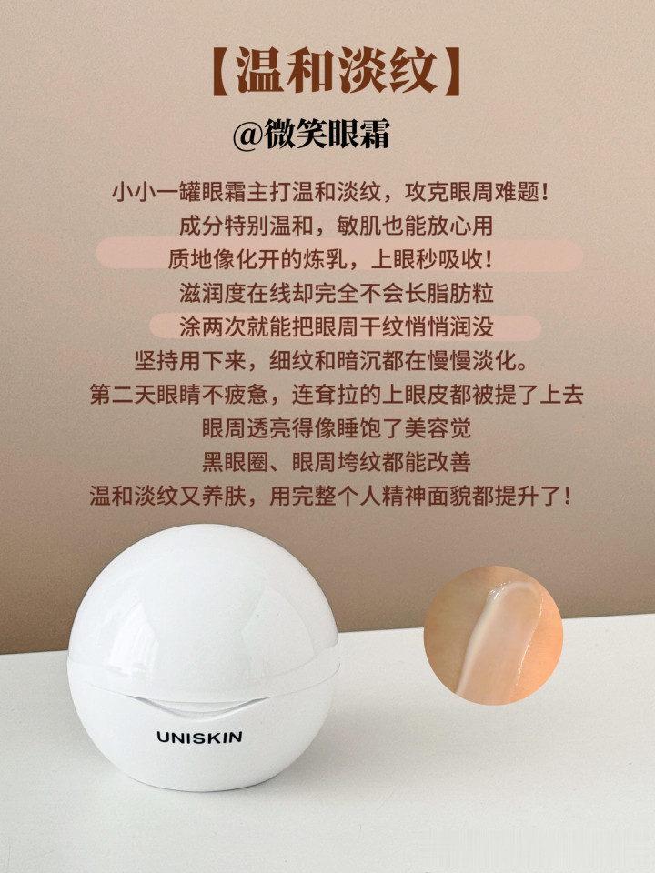 小小一罐眼霜主打温和淡纹,攻克眼周难题,成分特别温和,敏肌也能放心用。质地像化开的炼乳,上眼秒吸收,滋润度在线却完全不会长脂肪粒涂,两次就能把眼周干纹悄悄润没。
