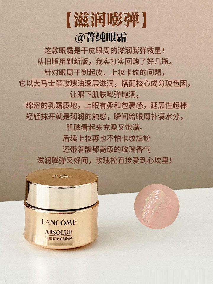 这款眼霜是干皮眼周的滋润膨弹救星,从旧版用到新版,我实打实回购了好几瓶。针对眼周干到起皮、上妆卡纹的问题,它以大马士革玫瑰油深层滋润,搭配核心成分玻色因,让眼下肌肤嘭弹饱满。