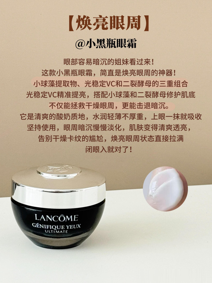 眼部容易暗沉的姐妹看过来,这款小黑瓶眼霜,简直是焕亮眼周的神器,小球藻提取物、光稳定VC和二裂酵母的三重组合,光稳定VC精准提亮,搭配小球藻和二裂酵母修护肌底,不仅能拯救干燥眼周,更能击退暗沉。