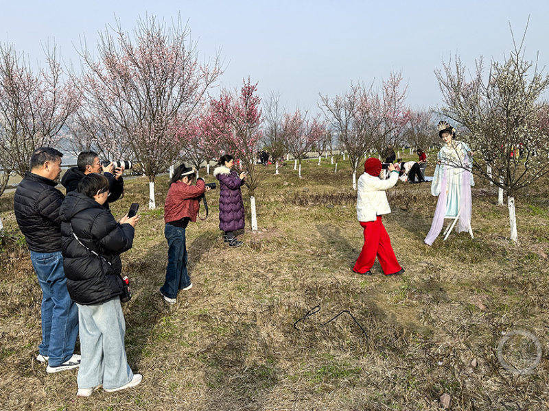 市民循香而来,赏花、拍照、野餐、歌舞。古风身影翩跹其下,琴歌悠然入耳,孩童嬉戏追逐……热闹的梅林江滩,处处洋溢着人与自然相融的鲜活气息。